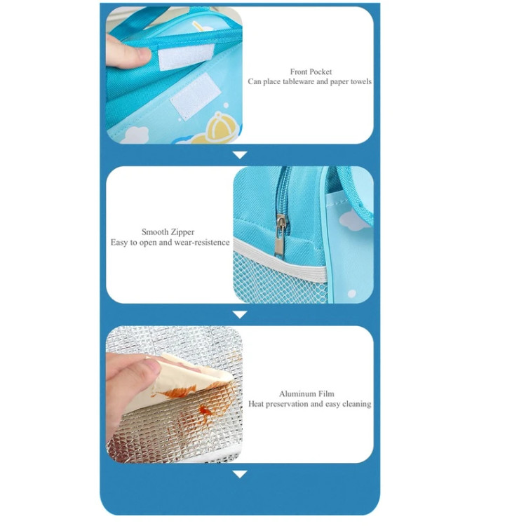 این کیف با ابعاد مناسب، فضای کافی برای قرار دادن ظرف غذا، قمقمه یا تنقلات را دارد و دستهی محکم آن حمل کیف را بسیار آسان کرده است.