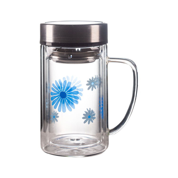 لیوان دستهدار پیرکس گلدار ۳۲۰ میلیلیتری – مدل دمنوشساز دو جداره با توری و درب استیل